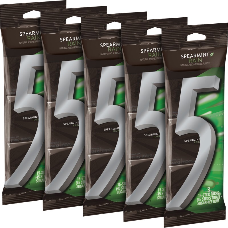 5 Gum Spearmint Rain Sugarfree Gum, 3 15-Piece Packages (Pack of 5)