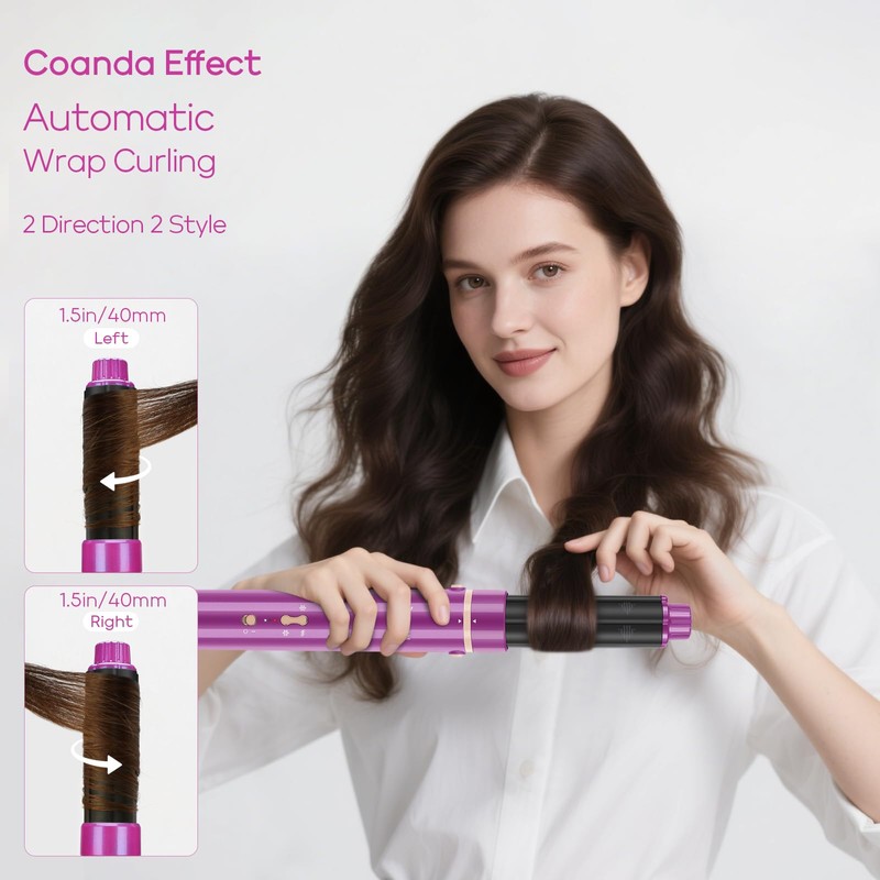 - Auto-Wrap Curlers with Coanda Effect for Effortless Volume - Say goodbye to manual curling struggles! The 2 x 28mm auto-wrap curlers use innovative air duct design, leveraging the Coanda effect to create powerful airflow that automatically adsorbs and wraps hair. Just select left/right barrels, put your hair close to the direction arrow symbol, natural-looking curls in minutes. The set includes 2 directional curlers, ideal for adding dimension to hair, while reducing heat exposure by 40% for healthier locks.