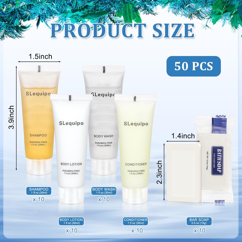 - 50 Pack in Total: 10pcs Mini soap bars in white, 10pcs Travel Size Body Wash (30ml), 10pcs Hotel Shampoo (30ml), 10pcs Body Lotion (30ml), 10 pcs Conditioner (30ml). The sufficient quantity and classic color can meet your daily use and gifting needs, and you can also share with your friends and family.