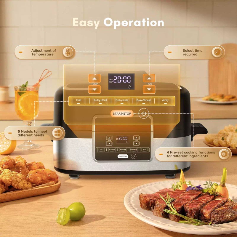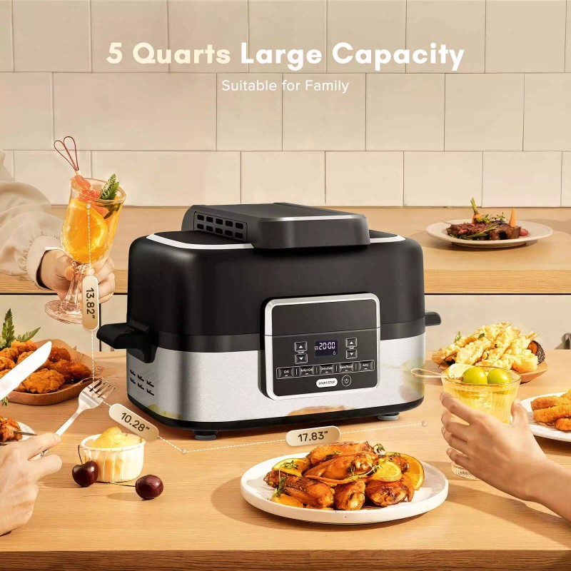 Getting ready to host a get-together? Cooking for a large and hungry family? The  5-Quart smart Air Fryer is just the thing you need. Its extra-large capacity can cook for 4 to 6 people. 86°F to 500°F Technology rapidly circulates heated air around the air fry basket.This electric indoor grill pan from realizes a 5-in-1 multifunctional design, which is not only capable of single-ingredient grilling, but also supports air frying, grilling, dehydrating, baking cakes, and separate air frying functions. Whether it's for everyday simple cooking or creative cuisine, the one machine can meet your diverse cooking needs.The indoor grill pan is equipped with a smart button control panel and LED display to make operation more convenient. You can easily select different cooking modes and temperature settings to enjoy a precise and convenient cooking process.After cooking cleanup couldn’t be more simple , just simple wiping to keep the appliance clean. Make your cooking process more pleasurable and enjoy the pleasure of food with ease.Come and choose our unique electric oven!