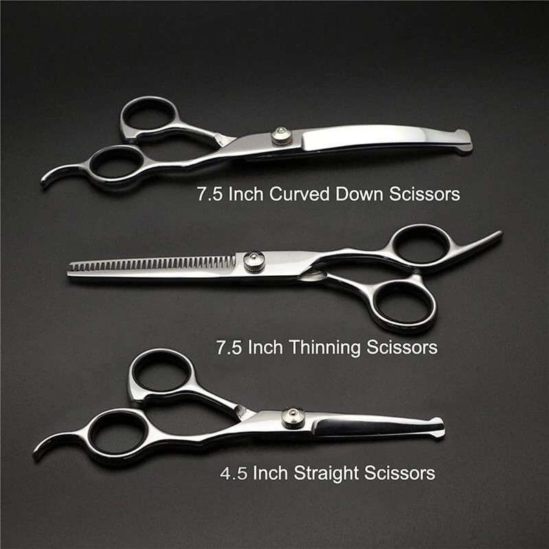 - Complete kit for comprehensive grooming - Dog Grooming Scissors Set with 8.1" Twin Tailed Straight Scissors + 7.5" Profeissonal Twin Tailed Thinning Scissors + 8.1" Twin Tailed Curved Down Scissors + Grooming Comb + Stylish black case suitable for left and right handed. Everything you need in one convenient place.It is also a perfect gift for your friends.