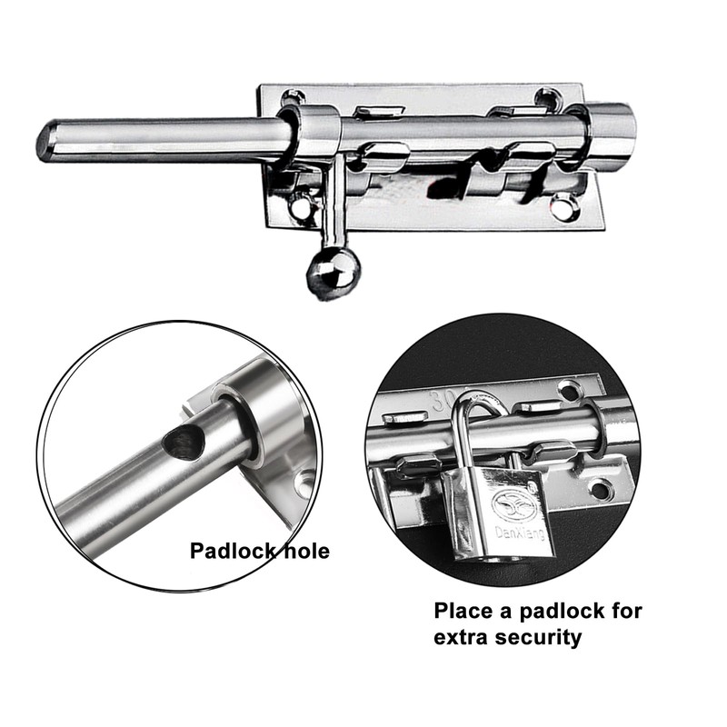 - Product Size: The size of main bolt body is 105 x 35mm(L x W); Receiver: 16.6 x 35mm(L x W); Mount hole diameter: 5mm; Each package includes 1pc stainless steel sliding door lock.