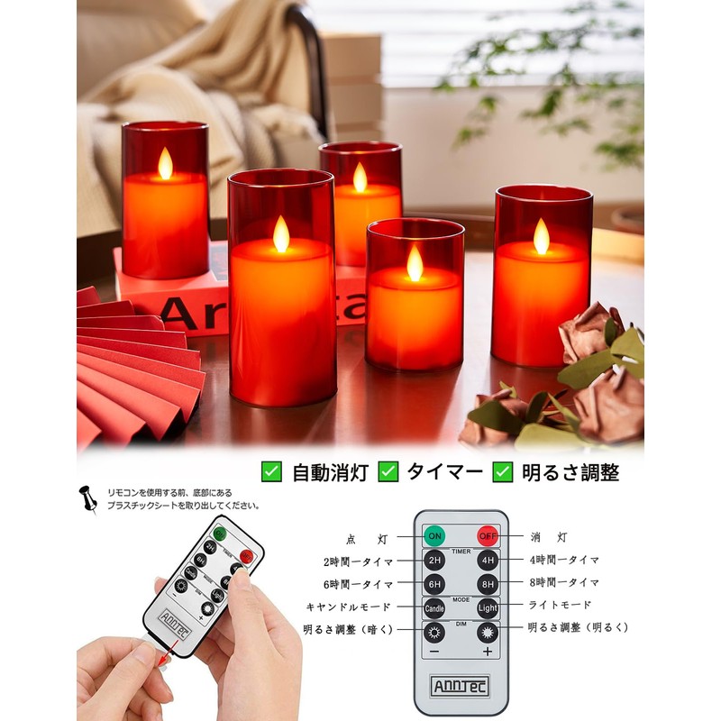 【5点セット】 LEDキャンドルライト AnnTec LEDキャンドル ロウソク ろうそく 電池式 専用リモコン付き 明るさ調整 自動消灯 タイマー 本物の炎のようにゆらめく 暖色光 火を使わない ゆらゆら揺れる 安全 省エネ ledライト【赤】