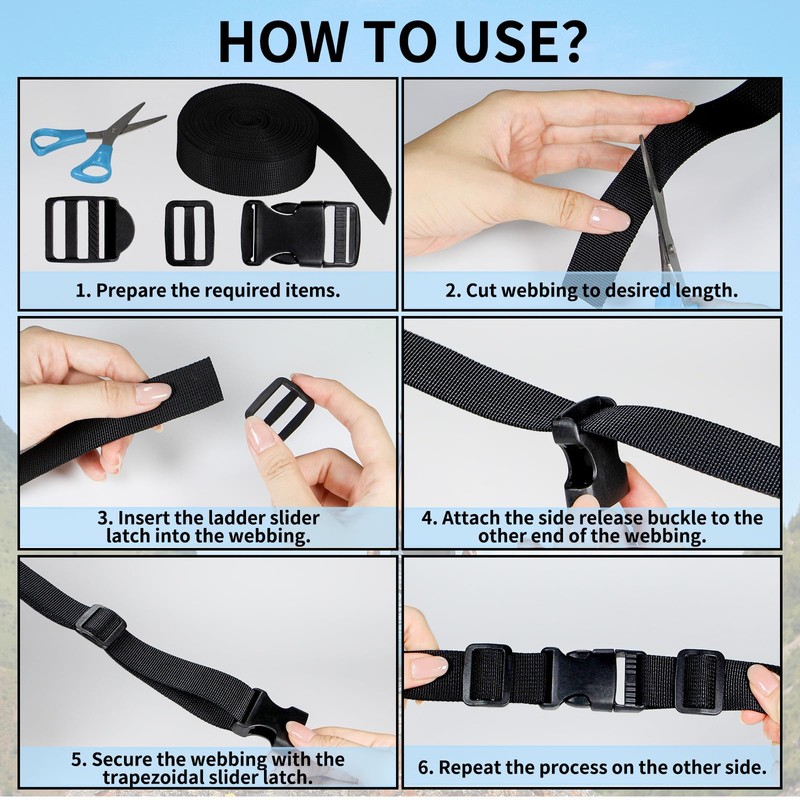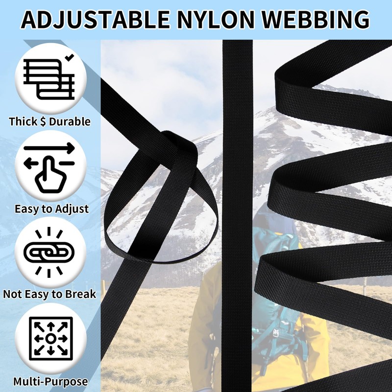 • Durable webbing: nylon webbing buckle is made of durable nylon, can withstand high loads and remains in a stable state, not easy to break or deform. Depending on the actual needs, you can easily adjust the length of durable webbing to fit different sizes of items.