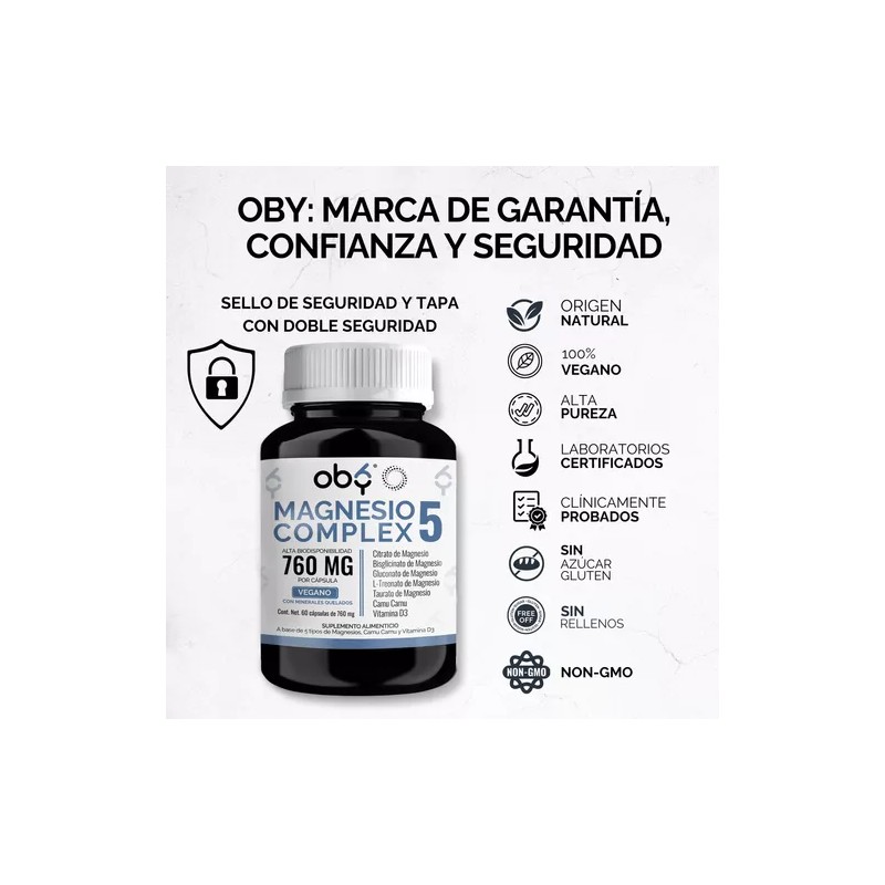 Oby va más allá trayendo 5 magnesios premium científicamente seleccionados (otros dan 4 o menos) y en su forma más biodisponible para garantizar máxima absorción y eficacia: Citrato de Magnesio, Bisglicinato de Magnesio, Treonato de Magnesio, Gluconato de Magnesio y Taurato de Magnesio).