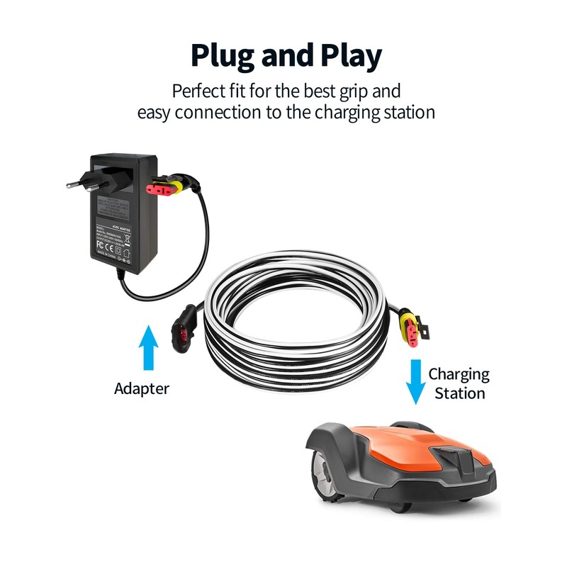- Connection cable, 5 m length - transformer cable for more flexibility and comfortable mowing. You can easily connect your transformer to the charging station and have enough room for convenient care of your lawn.