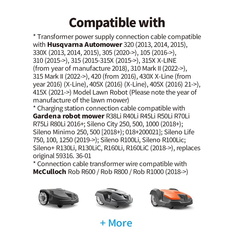 - Transformer connection cable compatible with Husqvarna Automower 320 (2013, 2014, 2015), 330X (2013, 2014, 2015), 305 (2020->),105 (2016->), 310 (2015->),315 (2015->),315 (2015->). 5->5->515X (2015->), 315X X-LINE (from year of manufacture 2018), 310 Mark II (2022->), 315 Mark II (2022- >),420 (from 2016), 430X X-Line (from 2016) (X-Line), 405X (2021-onwards). 415,415X (2021->) model lawn robot (please note the year of manufacture of the lawn mower)