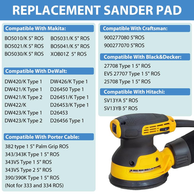- 【Compatible Models】Sander replacement pad compatible with Makita BO5010/K, BO5021/K, BO5030/K, BO5031/K, BO5041/K, DEWALT D26451/K,D26453/K,DW421,DW422,DW423,D26450,Porter Cable 382,343/343k,343VSK,390/390K etc.