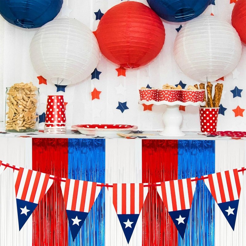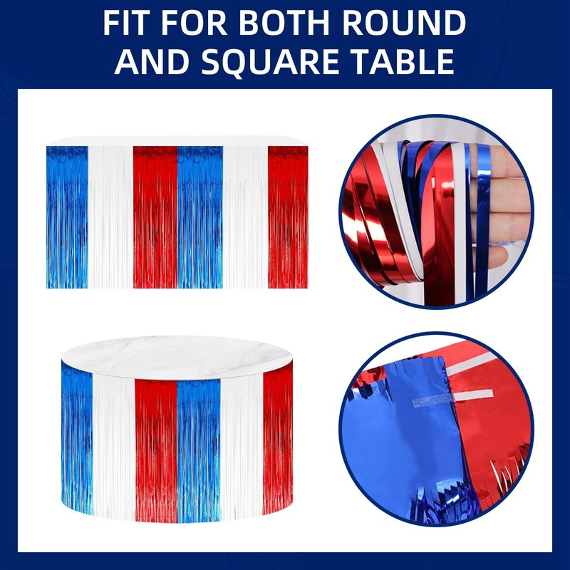 5 Pack 4th of July Foil Fringe Table Skirt 29x108 Inch Red White and Blue Metallic Foil Fringe Table Skirts for Rectangle and Round Tables for Memorial Day Independence Day Labor Day
