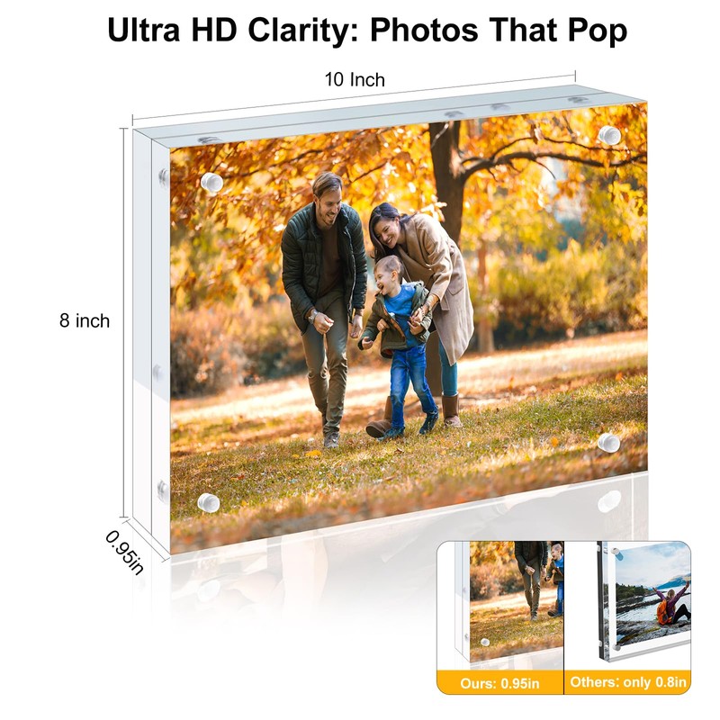 - 【Premium Dual-Sided 8x10 Picture Frame】Display two photos back-to-back in our thickened acrylic frame with magnetic corners for instant photo changes. Reinforced edges provide secure display on any surface, while the frameless design complements modern interiors. Ideal for desks, shelves, or creative arrangements.