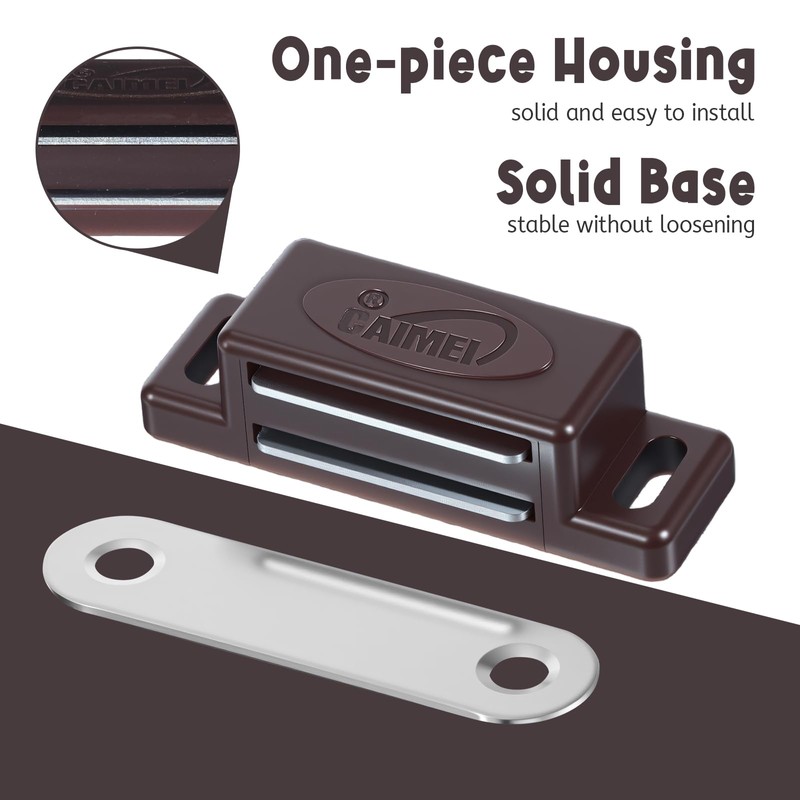 This brown magnetic door lock is made of ABS plastic and ferromagnetic composite material. It is lightweight, durable, rust-proof and moisture-proof. It is designed for small-sized cabinet doors. Each set includes a magnetic base and a metal plate, with 20 L-shaped screws, which can be fixed with screws or glued. It is suitable for cabinets, drawers, bookcases and other scenes. The magnetic force is stable, which effectively prevents the door panel from loosening. The matte brown appearance is low-key and practical, adding color to your furniture and can be well integrated into the modern home style.