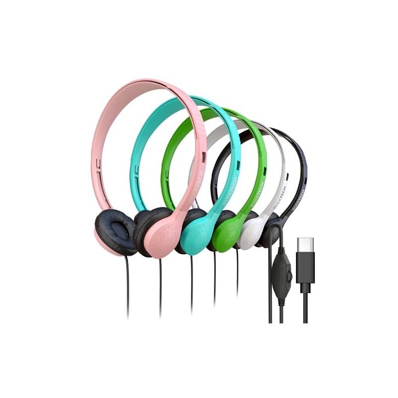 - 5 pack wired on-ear USB-C headphones, bulk set in a 5-color mix: black, white, blue, green, and pink—each with soft leather ear cushions, adjustable headband, rotatable earcups, and built-in volume control for comfort and flexibility