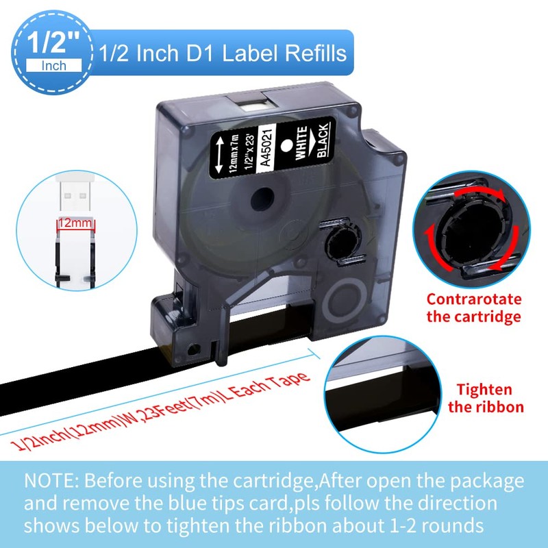 - Package Included: 5 Pack Compatible Dymo D1 Labels Tape Dymo 45021.Color: White Text Print on Black Background.Size: Width: 1/2 inch (12mm) each. Length: 23 feet (7m) each.