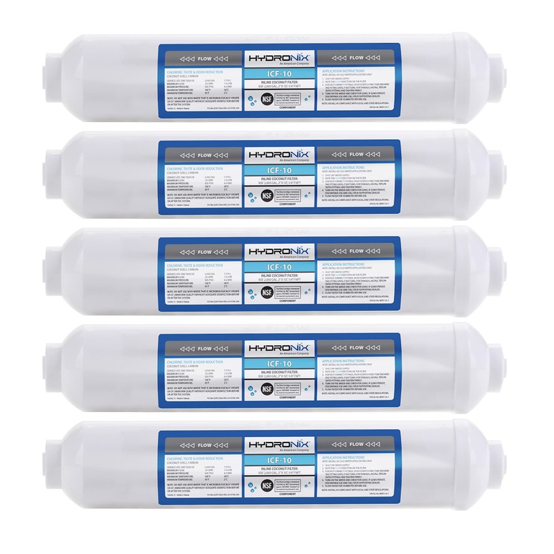 5 Pack - Hydronix ICF-10 Reverse Osmosis Post Polishing, Fridge & Ice Inline Coconut GAC Water Filter, 2000 Gal 1/4" NPT