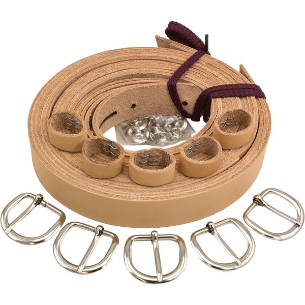 - Includes (5) 1" natural veg tanned belt black strips with turnbacks, (5) Nickel plate 1" heelbar buckles, (1) 10 Pack of 1/8" nickel open back chicago screws, and (5) Natural belt keepers.