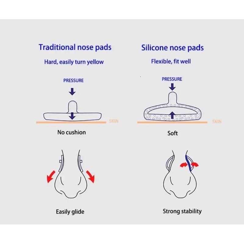 Superior anti slip soft comfort air chamber silicone nose pads.