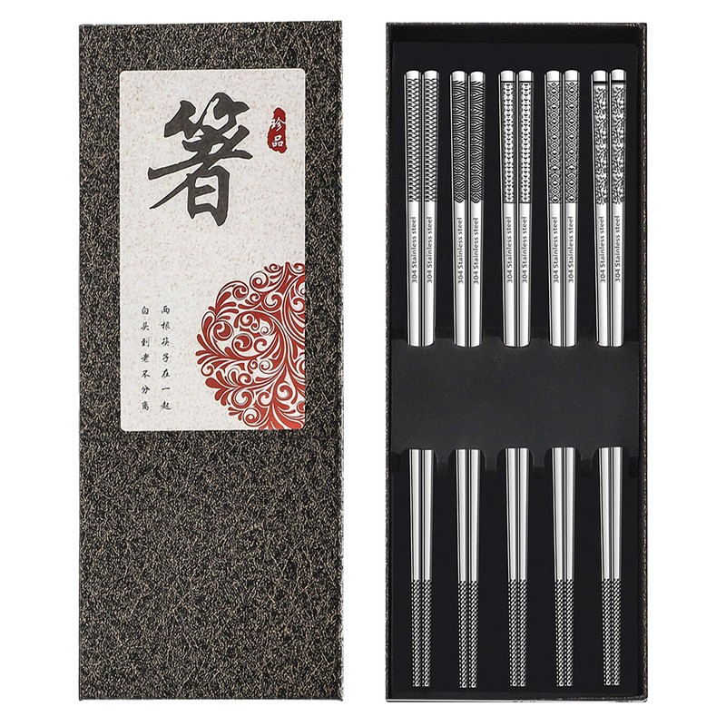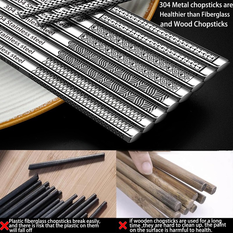 - 【5 Pairs Metal Chopsticks 】With 5Patterns: Our metal chopsticks set contain 5pairs metal chopsticks with 5different patterns. The patterns are etched by laser, which makes them not fade, not wear, beautiful and durable. The metal chopsticks are made of 304 stainless steel, which make them healthy and durable.
