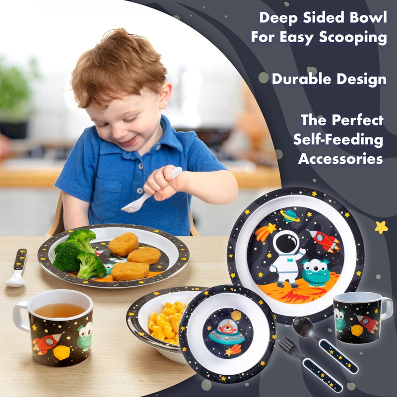 5 Pc Mealtime Feeding Set for Kids and Toddlers - Space - Includes Plate, Bowl, Cup, Fork and Spoon Utensil Flatware - Durable, Dishwasher Safe, BPA Free