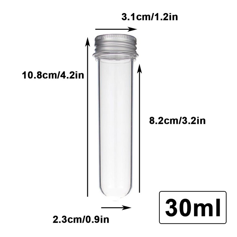 - PACKAGE INCLUDES: You will receive 5 pcs 30ml plastic test tubes. Test tube size 31x108 mm, enough to meet your different needs.