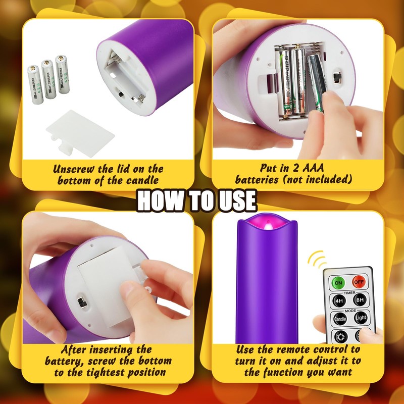 Each LED flameless pillar candle is battery operated by 2 AAA batteries, which are not included in the package, and you just need to rotate the bottom of the candle to turn it on or off, simple and convenient, leaving you a nice using experience.