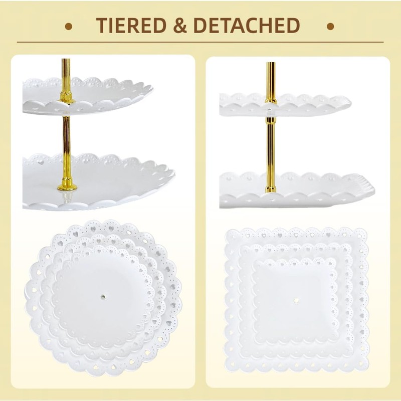 • Our dessert table display set is made of PP plastic, which is safe and reusable. Multi-layered design provides ample space to hold a decent amount of food, like cupcakes, cookies, finger sandwiches, scones, fruits, or small treats for your purposes