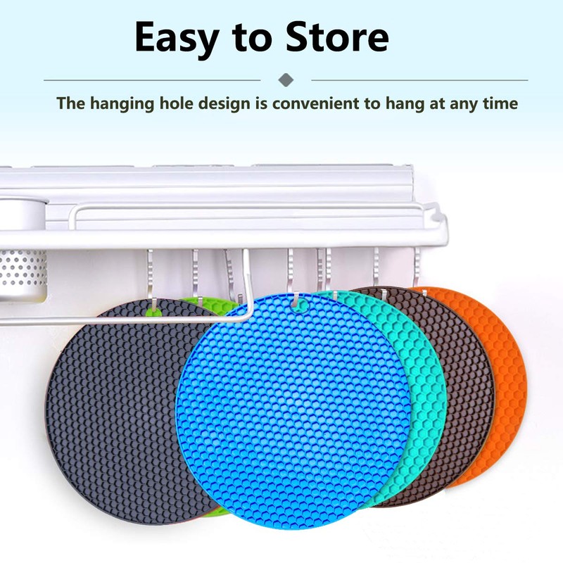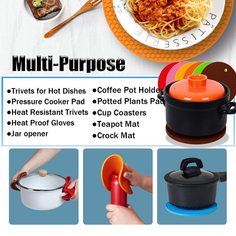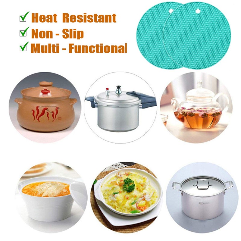 - ''' silicone#||# ❶★【PREMIUM FOOD-GRADE SILICONE】:The pot holder made up of FDA approved non-slip food-grade durable flexible silicone material,they won’t stain,mold or absorb odors.It’s safe to use in and out of the kitchen.#||# ❷★【0.3 THICK SILICONE POT HOLDER】Size:18 x 18 x 0.8cm (7 x 7 x 0.3),0.8cm thickness(0.3 inches)provides extra protection and soft comfort,package include 5 piece silicone teal pot coaster.#||# ❸★【HEAT RESISTANT UP TO 464°F】: Heat resistant,withstands temperatures from -30℃ to 240℃ (-22°F to 464°F ),Use it as a pot holder,trivet,jar opener,spoon rest or anywhere you need extra grip or exteme heat.#||# ❹★【DISHWASHER SAFE AND EASY STORE】:Easy to clean with hand wash,safety wash in dishwasher,waterproof,damp proof,when not in use, simply roll them up and store away inside a drawer or simply hang them on a hook.#||# ❺★【MULTIFUNCTIONAL HONEYCOMB COASTER】:Unique honeycomb design in the silicone,suitable for kitchen table countertop mats,bowls mat,dish mats,pot holders coasters,table mats.'''