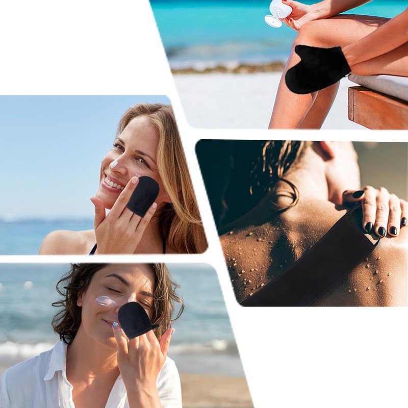 - Self Tan Mitt Set: Our tan mitt comes with 2 black fake tan mit, 1 black back tanner applicator, 1 tanning brush for body, and 1 body exfoliating mitt. The tanning mitt and brush can be used on various body parts (such as the face and hands), and the self tan back applicator makes it easy to reach those hard-to-reach areas.