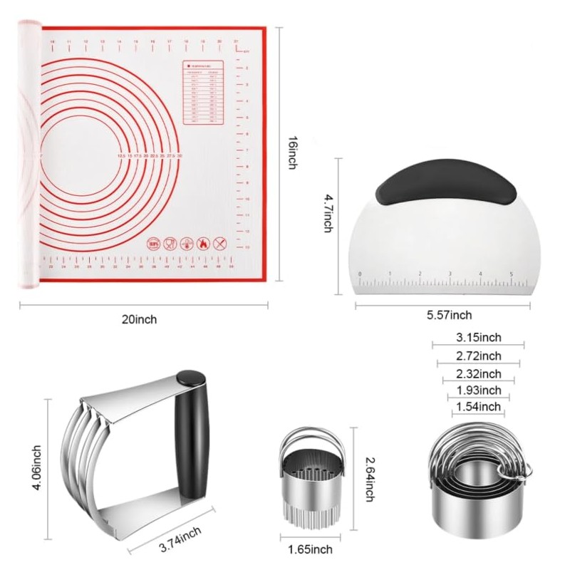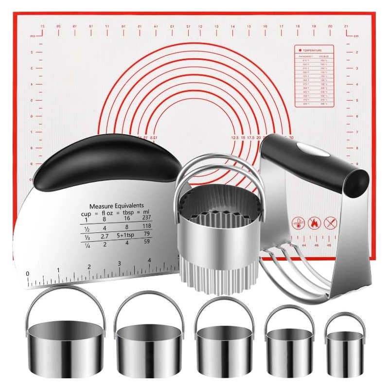 - COMPLETE SET: Professional 5-piece baking kit includes pastry blender, dough scraper, silicone baking mat, and stainless steel biscuit cutters in multiple sizes