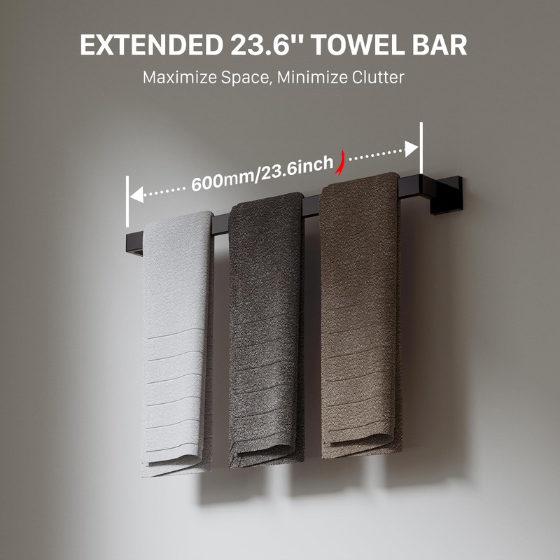 - 5-Piece Bathroom Accessories Set: Includes 1x 23.6-inch towel bars, 1x square towel rings, 2x hooks, and 1x toilet paper holders. This all-in-one solution meets all your bathroom accessory needs, saving time and effort while simplifying your daily routine.