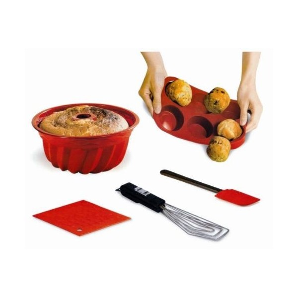 - Set includes Bundt Pan, 6 Cup muffin pan, 1 Hot pad, grip master, and spatula