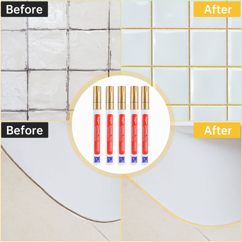 5 Pieces Grout Pen Gold Waterproof, Tile Restorer Pen, Joint Renewal Repair Marker with Replacement Tip, Quick Drying for Wall, Floor, Kitchens and Bathrooms