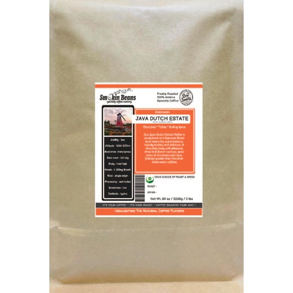 5-pound Java Dutch Estate (Fresh Roasted Coffee) Arabica Indonesia beans roasted-to-order daily full city roast whole bean we can grind provide lighter or darker roast upon request message at checkout