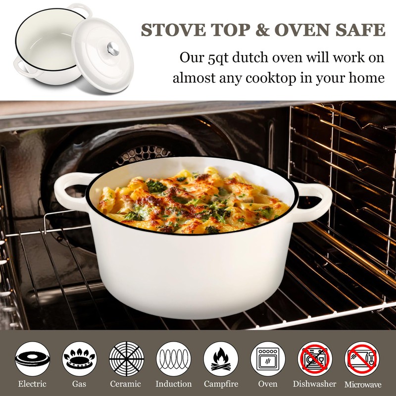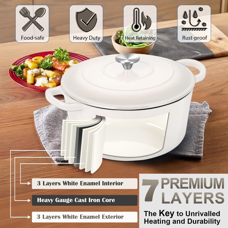 - 【PREMIUM POT】 Joyfair dutch oven is characterized by 4mm thick 7-layer pot wall to withstand years of use, Food-safe interior do not release harmful substances into the dishes, Heavy gauge cast iron core makes the structure solid and not easy to crack or deform, Cream White gloss enamel finish not only effectively prevents rust, Also decorates the kitchen with a beautiful view
