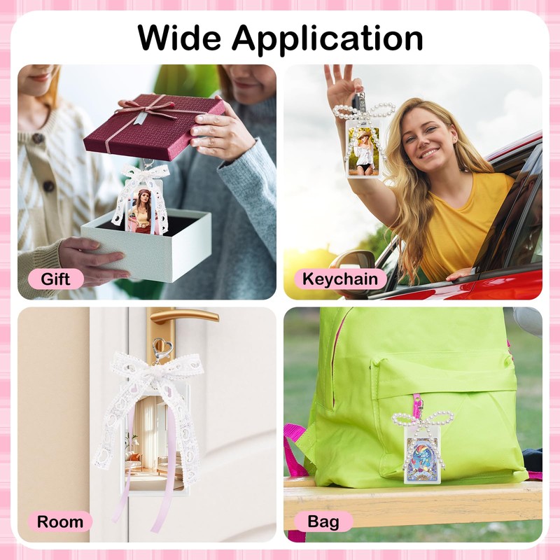 - Package Contents: You will receive 5 transparent acrylic photo card holders, including 2 lace bows, 2 pearl bows, and 1 butterfly-shaped charm, offering versatile styling options. Whether displaying Kpop photocards, idol photos, or everyday essentials like transit cards and IDs, these holders add a sweet and charming touch, personalizing your belongings