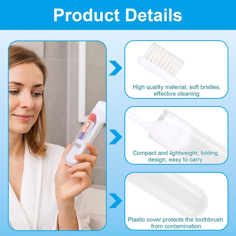 - 【Perfekte Portabilität】 Jede Zahnbürste und Zahnpasta-Kombination ist kompakt und leicht, mit einer Länge von nur 12cm im zusammengeklappten Zustand und 18cm im ausgeklappten Zustand. Das Gewicht von nur 20g pro Set ermöglicht einfaches Verpacken in Reisetaschen oder Handgepäck.