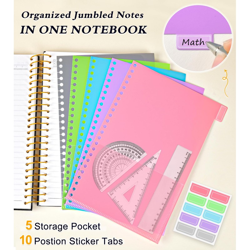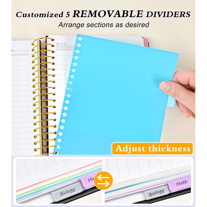 - 【5 Removable Pocket Divider】5 subject notebook come with 5 removable dividers allow free divided into 1-6 sections,enough to keep organized with all the different topic you have at school or work. Meanwhile each divider has a built-in 2.3in deep folder pocket to increase the storage function of the spiral journal notebook,add miscellaneous things such as frequently used stickers, notes, flashcards, etc. And the transparent design allows for quick identification without take them out.