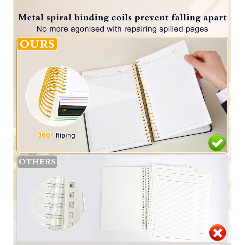 - 【360°Turn Around Metal Spiral Coil】Are you tired of repeatedly fixing fall out pages? Our 5 subject notebook use metal spiral binding coil,no more worrying about the page falling out of the spiral gap during use. The large coil provides plenty of space for smooth page turning allowing for 180°lay flat to write and 360°fold up for a comfortable writing position making your note taking more joyful and efficient.