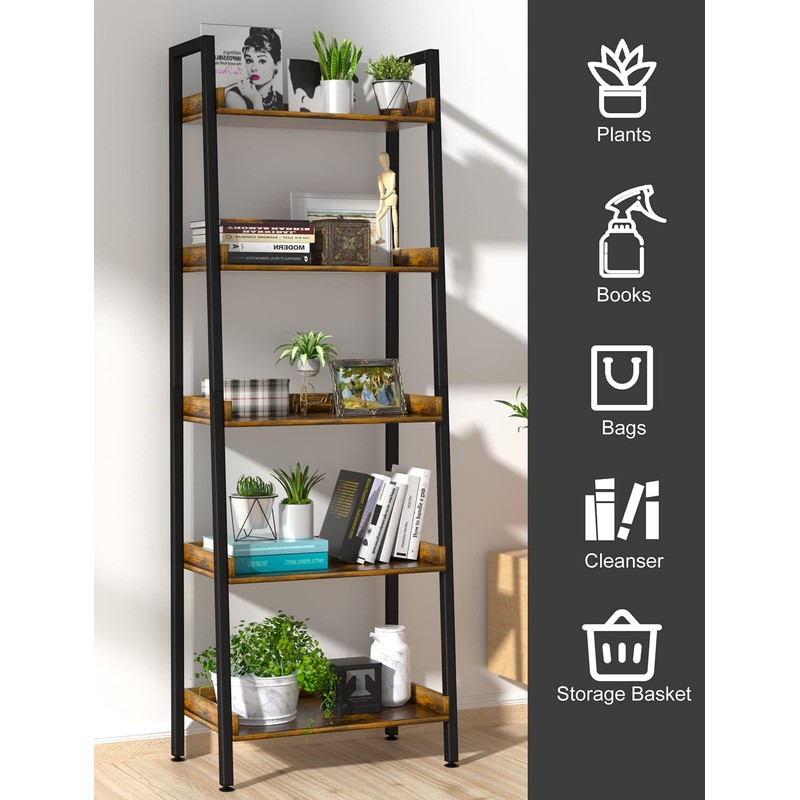 5-Tier Ladder Shelf, Ladder Bookshelf Storage Rack, Rustic Bookcase Wood Metal Freestanding Storage Shelf Display Shelf for Living Room, Home Office, Bedroom, Balcony, Industrial Style, Rustic Brown
