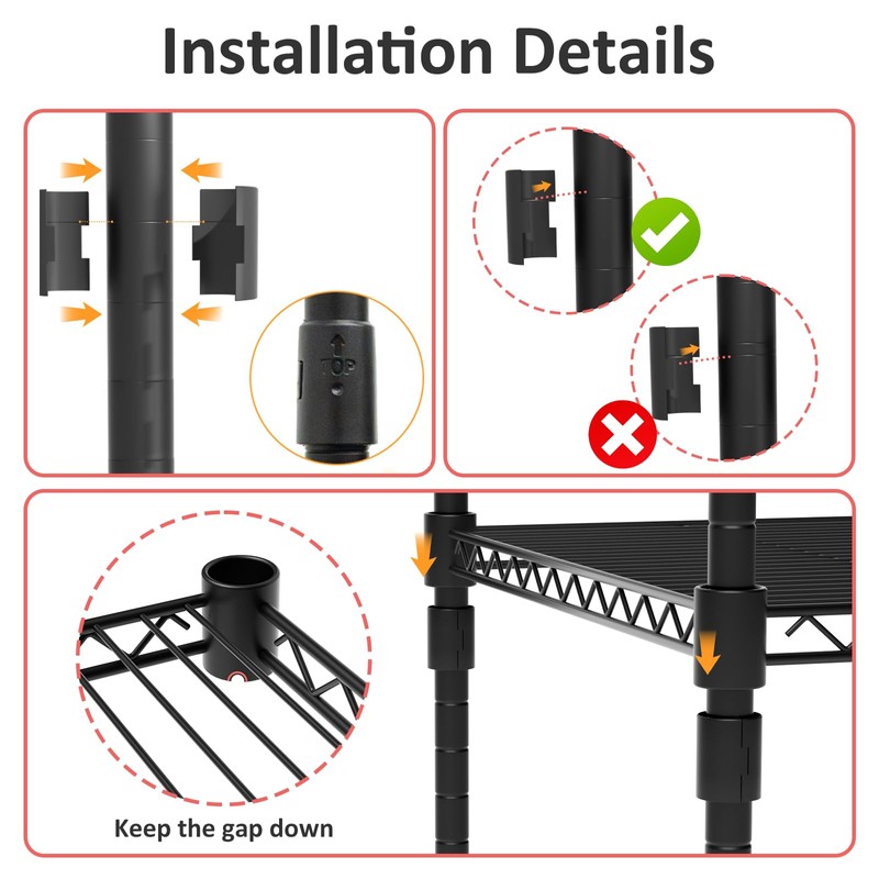 - 【Easy Assembly】The wire shelves with wheels is easy to assemble, does not require any tools, and the height of each layer can be adjusted according to needs, just clamp the metal grid plate on the column, and then slide the metal grid plate along the column until the metal shelf is firmly fixed on the buckle. The shelving with wheels also comes with a user manual to guide you through the quick and easy assembly process.