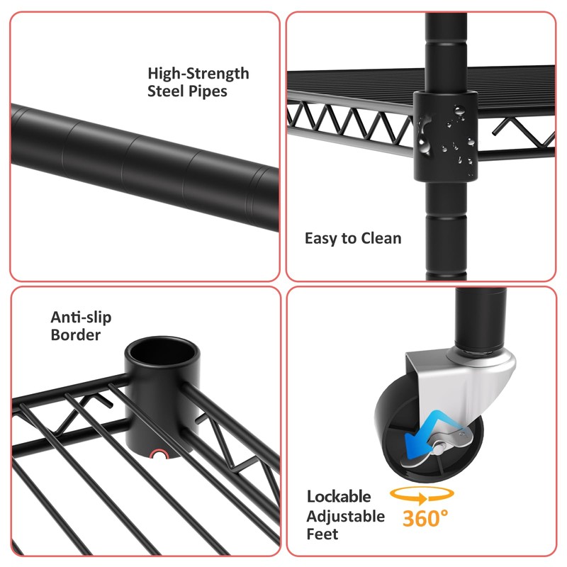 - 【Adjustable Feet and Convenient Wheels】The wire shelving with wheels comes with 4 sturdy 360 degree rollers, two of which can be locked, so you can push the storage shelves with wheels to where you need it, anytime, anywhere, and keep it in place. The adjustable leveling feet can keep the metal shelves in a fixed position, so that the device can maintain balance and stability, and solve the problem of uneven ground.