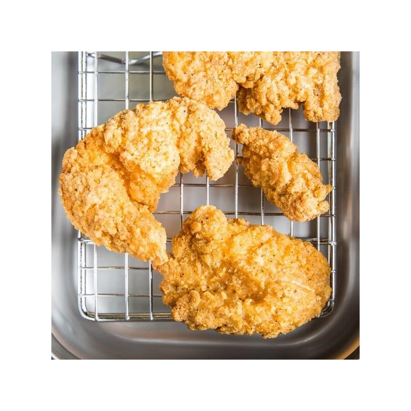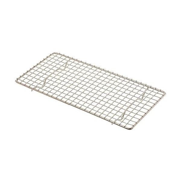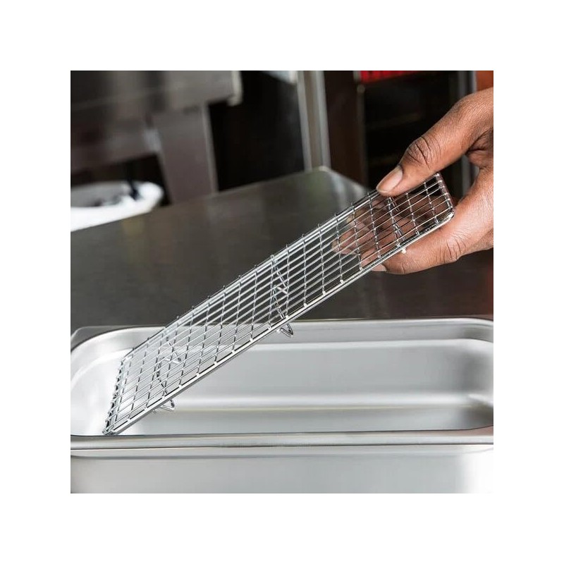 - Durable Construction: Made from strong chrome-plated wire for long-lasting use. Effective Draining: Ideal for draining boiled or fried foods, keeping them crisp and grease-free. Enhanced Airflow: Footed design elevates food to improve air circulation for faster cooling. Perfect Fit: Sized to fit 1/3 size steam table pans (10" L x 5" W). Versatile Use: Great for decorating and cooling pastries, ensuring even results.