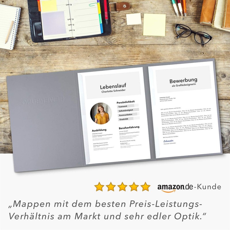 • 5 x application folders: 5 pieces three-part application folders – double hinged – in grey – at the best possible price-performance ratio in shock-proof packaging.