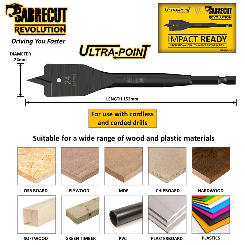 SabreCut Revolution Impact rated spade bits features a extra thick toughened shank designed for use in impact drivers, combi drills and drill drivers. Professional quality impact spade bits with a universal 1/4" hex. Can also be used in standard chucks for a secure non slip fit.
