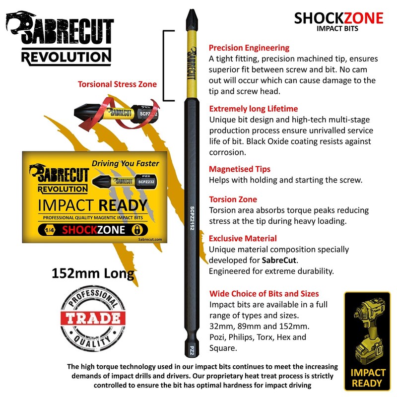 SabreCut Revolution impact driving accessories are specifically designed to handle the most demanding IMPACT driving applications. The full range of SabreCut products are made from material compositions which have been carefully selected, designed and engineered to give optimised durability and unbeatable break resistance, saving you both time and money.