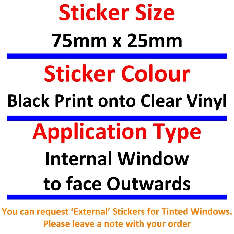 - 75mm x 25mm in size - Black Print onto a Clear Background for Internal Window Application to Face Outwards