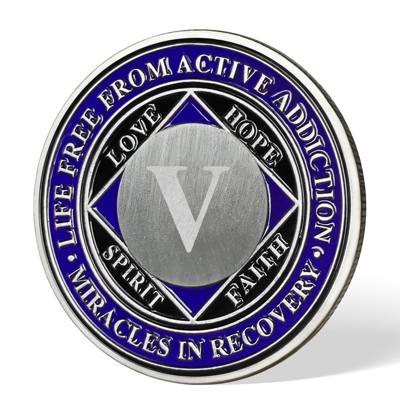 - 🤲Vivid Imagery: The front of this NA chip showcases a vibrant depiction of a hand reaching upward, with deep blue and violet hues representing serenity and strength. The intricate design, including rays emanating from the hand, symbolizes growth, support, and the foundation of recovery. This 5 year recovery coin serves as a powerful visual reminder of the peace and resilience found through sobriety, making it a meaningful token for Narcotics Anonymous (NA) members.