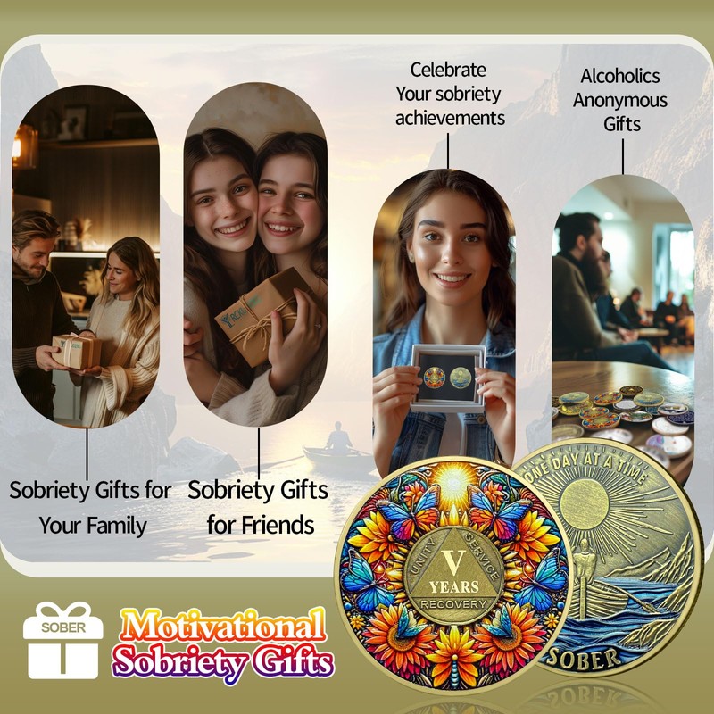 5 Year Sobriety Coin Sunflower Five Year Sobriety Coins Butterfly AA Chips and Medallion One Day at A Time AA NA Coin Recovery Anniversary Token Sobriety Gifts for Men Women Alcoholics Anonymous Gift