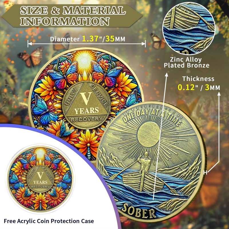 - Exquisite Front Design: The obverse of this sobriety chips features colourful flowers and butterflies, with the AA logo and the three pillars of the organisation in the centre, and the sun's rays streaming out from above, representing the rebirth and beautiful changes that come with sobriety. The Roman numerals engraved in the centre represent the length of sobriety, an important sobriety milestone for the wearer to remember