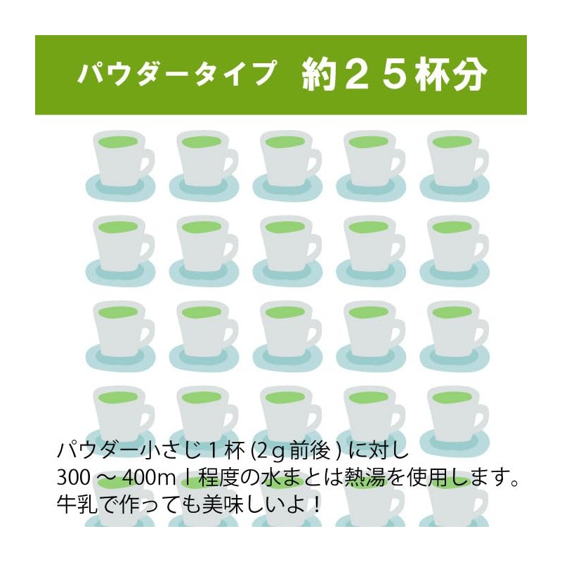 - 飲み方:パウダー小さじ1杯(2g前後)に対し、300~400ml程度の水まとは熱湯を使用します。お好みの濃さに調整してお飲みください。