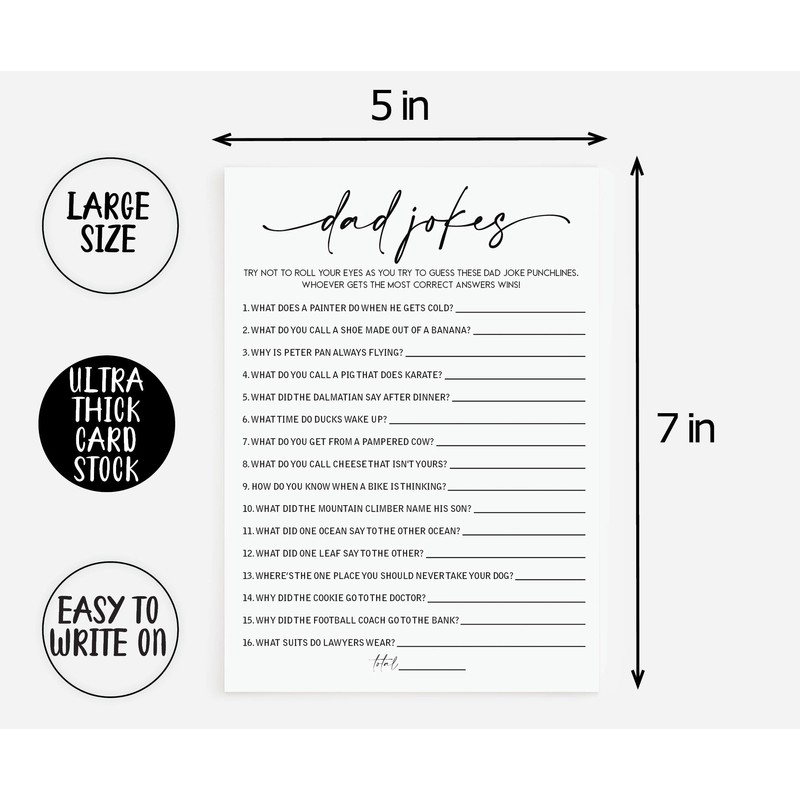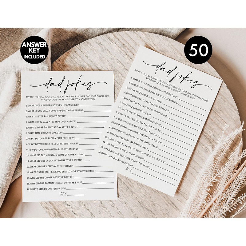 - ✔FUN ACTIVITY - 50 Dad Joke game cards. Fun, easy game for a baby shower. Gender neutral design is intended to go with any baby shower theme. Answer Key Included.